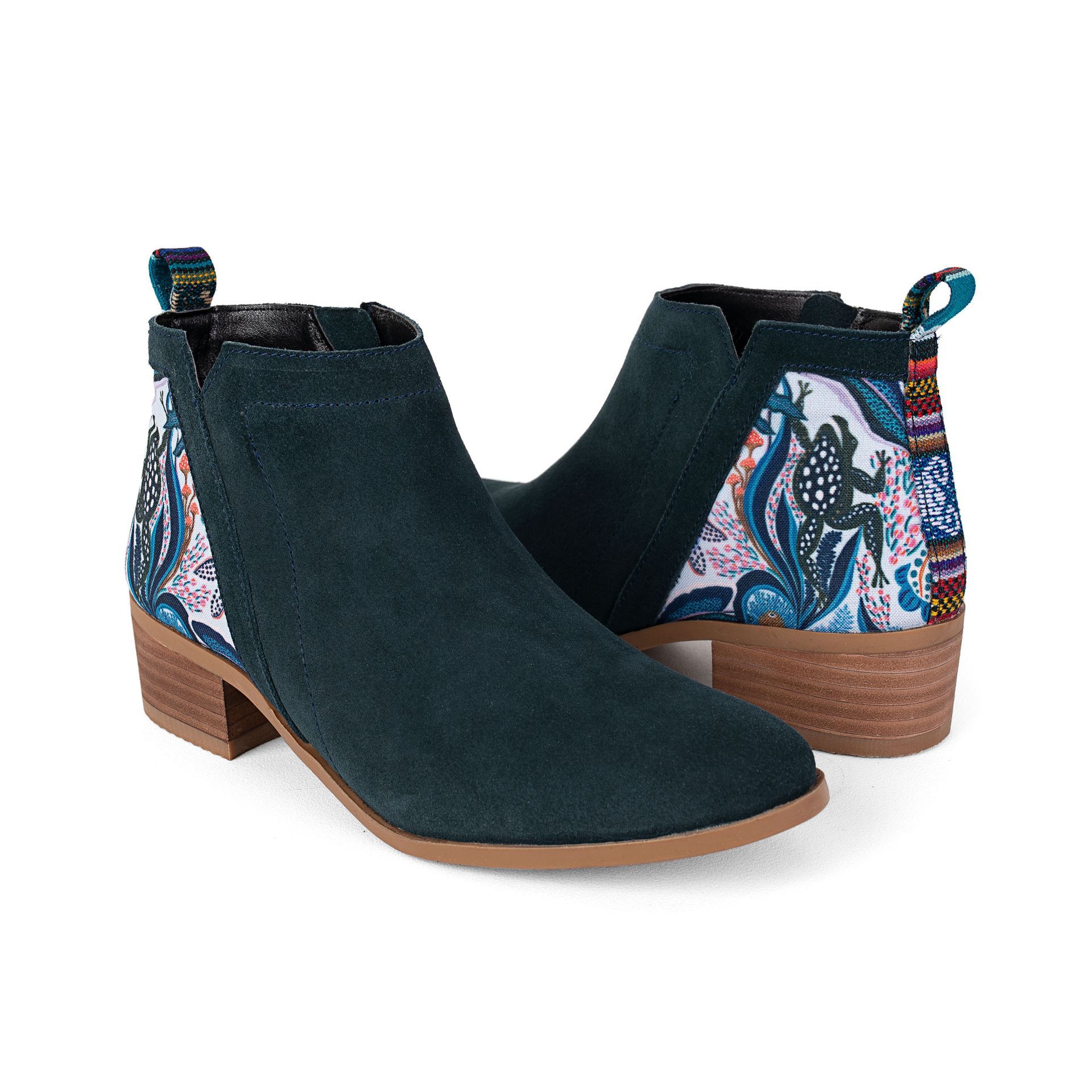 Laat je betoveren door deze fantastische laarsjes! Dit ontwerp is een sprankelende ode aan de levendige Amazone-rivier in Brazilië, ook wel bekend als de drijvende weide van de Amazone. In deze betoverende onderwateroase kom je oog in oog te staan met schattige melkkikkers, schitterende roze orchideeën, en zelfs lippenstiftbomen en passievruchtbomen! De prachtige salamander op het blauwgroene suède maakt dit natuurwonder helemaal compleet. Draag deze laarsjes en neem een stukje Amazone met je mee!